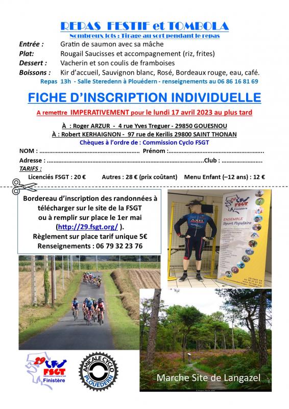 Il s'en suivra un REPAS FESTIF à 13h avec sa tombola,  à la salle Steredenn, réservations au 06 86 16 81 69, avant le 17 avril 2023.