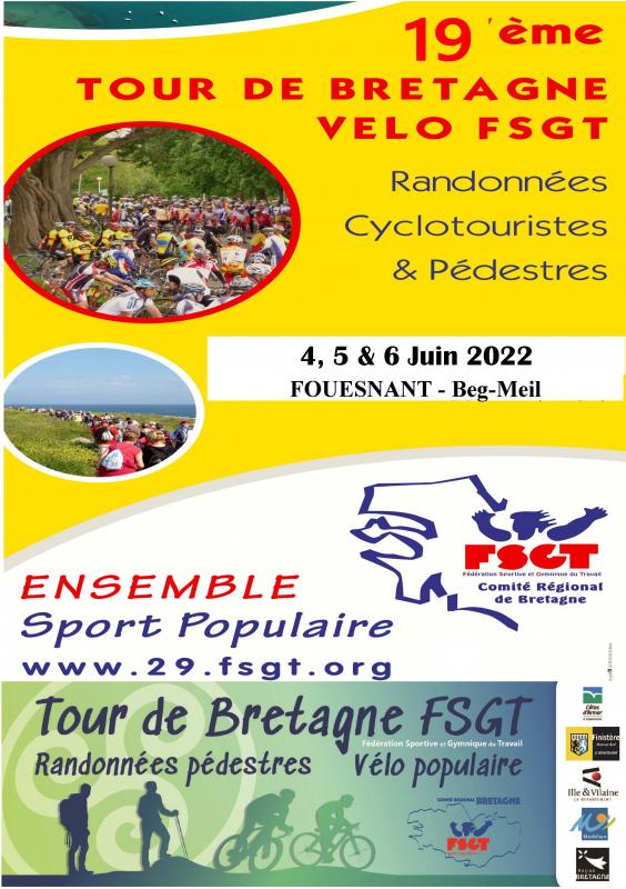 Le collectif d’organisation, composé de militants sportifs issus des clubs FSGT, placé sous l’égide du Comité Régional FSGT Bretagne est très heureux de vous accueillir au 19ème TOUR DE BRETAGNE FSGT Vélo et Randonnées pédestres qui aura lieu les 4,5&6 juin 2022 à Fouesnant - Beg-Meil (départ du « Villages Clubs du Soleil »)