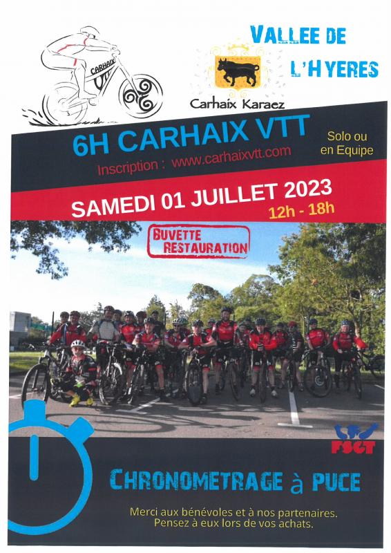 Le club de CARHAIX VTT est heureux de vous inviter aux 6h VTT le samedi 1er Juillet 2023 dans la vallée de l’Hyères à Carhaix.