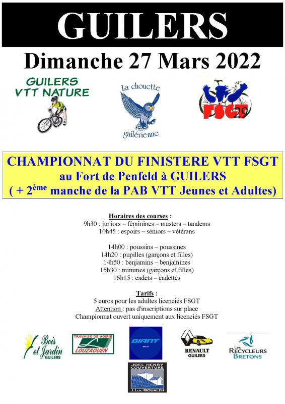 Le Dimanche 27 mars 2022, Guilers VTT Nature organisera, au Fort de Penfeld à Guilers (près du parc des expositions à Penfeld), le Championnat du Finistère VTT FSGT (+ 2ème manche de la PAB VTT Jeunes et Adultes).