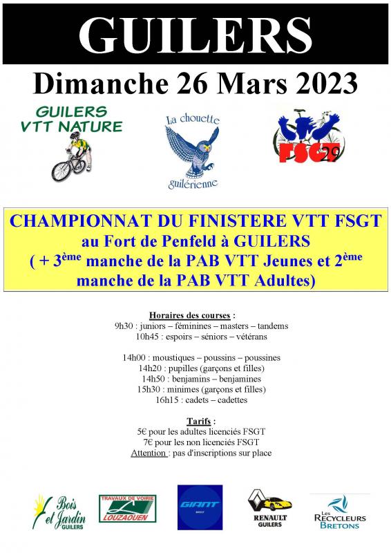 Bonjour, Le comité informe que Le Dimanche 26 mars 2023, Guilers VTT Nature organisera, au Fort de Penfeld à Guilers (près du parc des expositions à Penfeld), le Championnat du Finistère VTT FSGT (+ 3ème manche de la PAB VTT Jeunes et 2ème manche de la PAB VTT Adultes).