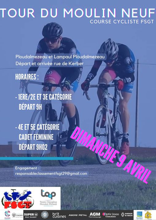 Bonjour, Avec grand plaisir Le club TEAM OXYGENE PLOUDAL PORTSALL vous attend , à Ploudalmézeau, pour la traditionnelle course cycliste "Le tour de Moulin Neuf" dimanche 9 avril dés 9 h pour le 1er départ et quelques minutes après pour celui de la seconde course du jour.