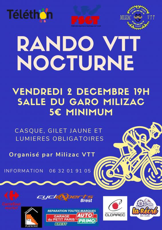 Le club de MILIZAC VTT est heureux de vous convier à sa traditionnelle Rando VTT nocturne et solidaire, dans le cadre du Téléthon.