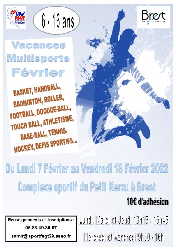 Les inscriptions pour les VACANCES MULTISPORTS sont ouvertes… elle se déroule du LUNDI 7 FEVRIER au VENDREDI 18 FEVRIER 2022 au COMPLEXE SPORTIF DU PETIT KERZU A BREST pour les enfants et les jeunes de 6 à 16 ans.